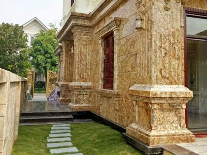 Đá vàng đậm toát lên sự mạnh mẽ, thịnh vượng, lý tưởng cho biệt thự hiện đại như công trình của chị Hương. Vân đá loang nhẹ, dễ phối với sơn xám nhạt, không lộ vết bẩn sau mưa. Khi kết hợp đèn LED, mặt tiền vàng đậm trở nên lung linh. Tạo ấn tượng mạnh mẽ vào ban đêm.