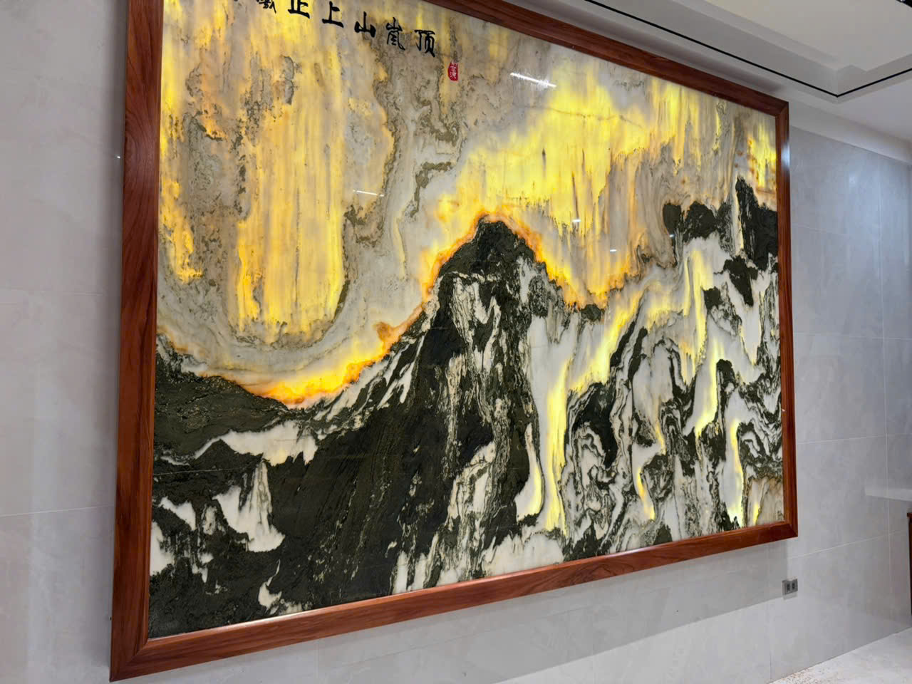 Trong các phòng khách mở, tranh đá ốp tường được sử dụng làm vách ngăn giữa khu vực tiếp khách và bếp hoặc phòng ăn. Đá xuyên sáng như onyx, kết hợp với đèn LED, tạo hiệu ứng ánh sáng lung linh. Giúp không gian vừa thoáng đãng vừa tinh tế.